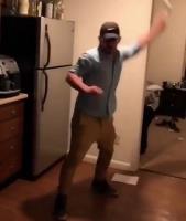 Un mec tente de briser une bouteille de bière dans une cuisine