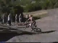 Un fille tente de sauter dans un étang avec son vélo mais elle se plante sur le tremplin