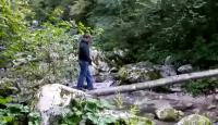Un homme traverse une rivière en marchant sur un tronc d'arbre