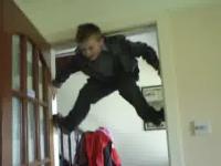 On a trouvé le fils de spiderman, il grimpe sur le montant d'une porte, mais lache les mains ...