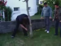 Un homme veut abatre un arbuste mais lache sa hache dans la foule