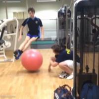 Un abrutis enlève un ballon d'exercice alors que son pote saute dessus