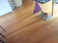 Un gars s'amuse à faire foncer son chat dans une pile de gobelet à l'aide d'un pointeur laser